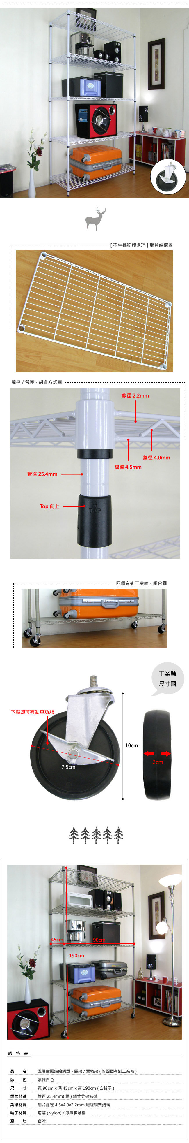 45公分X90公分X190公分-五層金屬鐵線網架/置物架(素雅白)-附四個工業輪 ◆五層金屬[鐵線]網架-置物架,每層平圴承重力約100公斤(整組平圴承重力約500公斤)。 ◆100%台灣製造,結構簡單、組合方便,拆裝容易,不傷網架本體,再次使用品質不變。 ◆本商品表面為素雅白[不生鏽粉體處理],網架完全可DIY組裝,結構簡單、拆組容易。 ◆每片金屬[鐵線]網架高度,可依需求自行調整,要高要低隨心所欲,可依照需求隨時調整。 ◆金屬[鐵線]網架,任何地點皆適用,營業用,工業用,家庭用,店面,倉儲,住家,搭配性強。 ◆鐵線材質:網片線徑4.5x4.0x2.2mm(橫線16條/直線6條)鐵線網架 結構,粉體防鏽處理,耐刮、耐磨。 ◆商品為尺寸為90 公分[寬] X 45 公分[深] X 190 公分[高](含輪子)。 ◆鋼管材質:鋼管管徑25.4mm(粗) 鋼管骨架 結構 。 ◆商品產地:[精品嚴選] 100%台灣製造。 ◆商品屬性:簡單DIY。 輪子特性: ◆本商品為四個[3”英吋]75mm [網架專用]工業用輪子。 ◆本商品輪子材質為尼龍(Nylon) +厚鐵板結構製造而成。 ◆本商尺寸為7.5公分[寬] X 4公分[深] X 10公分[高](簡單DIY)。 ◆四個工業輪的平圴承重力約200公斤(每個輪子皆附有剎車功能)。