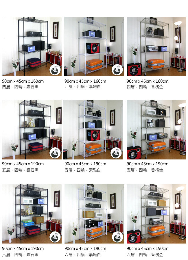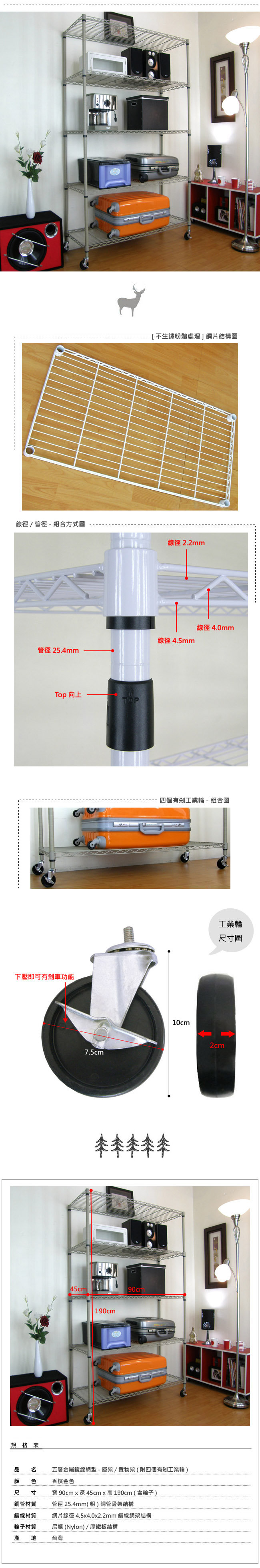 45公分X90公分X190公分-五層金屬鐵線網架/置物架(香檳金)-附四個工業輪 ◆五層金屬[鐵線]網架-置物架,每層平圴承重力約100公斤(整組平圴承重力約500公斤)。 ◆100%台灣製造,結構簡單、組合方便,拆裝容易,不傷網架本體,再次使用品質不變。 ◆本商品表面為香檳金[不生鏽粉體處理],網架完全可DIY組裝,結構簡單、拆組容易。 ◆每片金屬[鐵線]網架高度,可依需求自行調整,要高要低隨心所欲,可依照需求隨時調整。 ◆金屬[鐵線]網架,任何地點皆適用,營業用,工業用,家庭用,店面,倉儲,住家,搭配性強。 ◆鐵線材質:網片線徑4.5x4.0x2.2mm(橫線16條/直線6條)鐵線網架 結構,粉體防鏽處理,耐刮、耐磨。 ◆商品為尺寸為90 公分[寬] X 45 公分[深] X 190 公分[高](含輪子)。 ◆鋼管材質:鋼管管徑25.4mm(粗) 鋼管骨架 結構 。 ◆商品產地:[精品嚴選] 100%台灣製造。 ◆商品屬性:簡單DIY。 輪子特性: ◆本商品為四個[3”英吋]75mm [網架專用]工業用輪子。 ◆本商品輪子材質為尼龍(Nylon) +厚鐵板結構製造而成。 ◆本商尺寸為7.5公分[寬] X 4公分[深] X 10公分[高](簡單DIY)。 ◆四個工業輪的平圴承重力約200公斤(每個輪子皆附有剎車功能)。