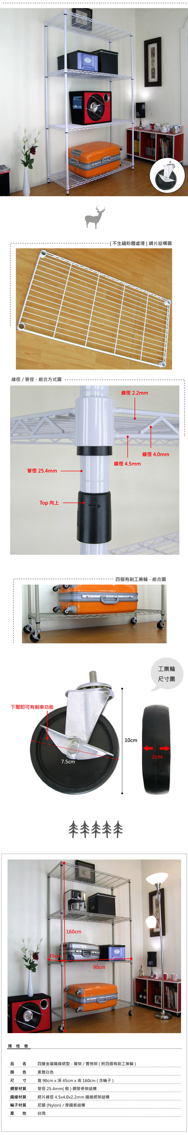 45公分X90公分X160公分-四層金屬鐵線網架/置物架(素雅白)-附四個工業輪 ◆四層金屬[鐵線]網架-置物架,每層平圴承重力約100公斤(整組平圴承重力約400公斤)。 ◆100%台灣製造,結構簡單、組合方便,拆裝容易,不傷網架本體,再次使用品質不變。 ◆本商品表面為素雅白[不生鏽粉體處理],網架完全可DIY組裝,結構簡單、拆組容易。 ◆每片金屬[鐵線]網架高度,可依需求自行調整,要高要低隨心所欲,可依照需求隨時調整。 ◆金屬[鐵線]網架,任何地點皆適用,營業用,工業用,家庭用,店面,倉儲,住家,搭配性強。 ◆鐵線材質:網片線徑4.5x4.0x2.2mm(橫線16條/直線6條)鐵線網架 結構,粉體防鏽處理,耐刮、耐磨。 ◆商品為尺寸為90 公分[寬] X 45 公分[深] X 160 公分[高](含輪子)。 ◆鋼管材質:鋼管管徑25.4mm(粗) 鋼管骨架 結構 。 ◆商品產地:[精品嚴選] 100%台灣製造。 ◆商品屬性:簡單DIY。 輪子特性: ◆本商品為四個[3”英吋]75mm [網架專用]工業用輪子。 ◆本商品輪子材質為尼龍(Nylon) +厚鐵板結構製造而成。 ◆本商尺寸為7.5公分[寬] X 4公分[深] X 10公分[高](簡單DIY)。 ◆四個工業輪的平圴承重力約200公斤(每個輪子皆附有剎車功能)。