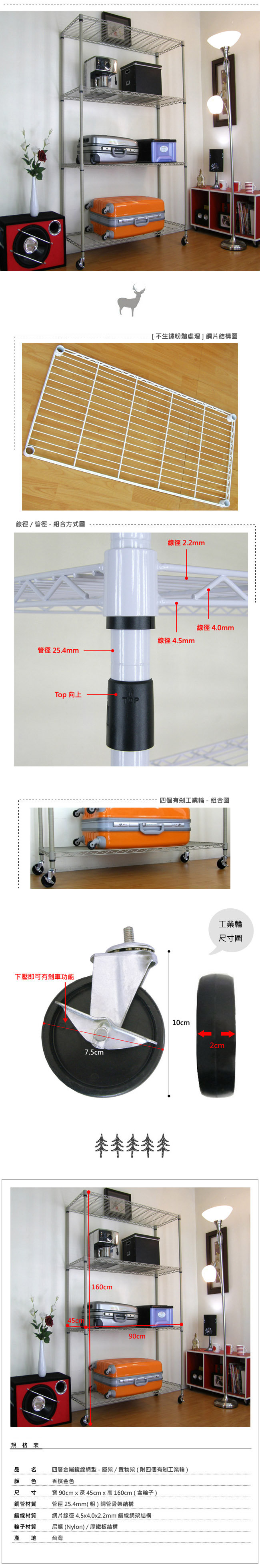 45公分X90公分X160公分-四層金屬鐵線網架/置物架(香檳金)-附四個工業輪 ◆四層金屬[鐵線]網架-置物架,每層平圴承重力約100公斤(整組平圴承重力約400公斤)。 ◆100%台灣製造,結構簡單、組合方便,拆裝容易,不傷網架本體,再次使用品質不變。 ◆本商品表面為香檳金[不生鏽粉體處理],網架完全可DIY組裝,結構簡單、拆組容易。 ◆每片金屬[鐵線]網架高度,可依需求自行調整,要高要低隨心所欲,可依照需求隨時調整。 ◆金屬[鐵線]網架,任何地點皆適用,營業用,工業用,家庭用,店面,倉儲,住家,搭配性強。 ◆鐵線材質:網片線徑4.5x4.0x2.2mm(橫線16條/直線6條)鐵線網架 結構,粉體防鏽處理,耐刮、耐磨。 ◆商品為尺寸為90 公分[寬] X 45 公分[深] X 160 公分[高](含輪子)。 ◆鋼管材質:鋼管管徑25.4mm(粗) 鋼管骨架 結構 。 ◆商品產地:[精品嚴選] 100%台灣製造。 ◆商品屬性:簡單DIY。 輪子特性: ◆本商品為四個[3”英吋]75mm [網架專用]工業用輪子。 ◆本商品輪子材質為尼龍(Nylon) +厚鐵板結構製造而成。 ◆本商尺寸為7.5公分[寬] X 4公分[深] X 10公分[高](簡單DIY)。 ◆四個工業輪的平圴承重力約200公斤(每個輪子皆附有剎車功能)。
