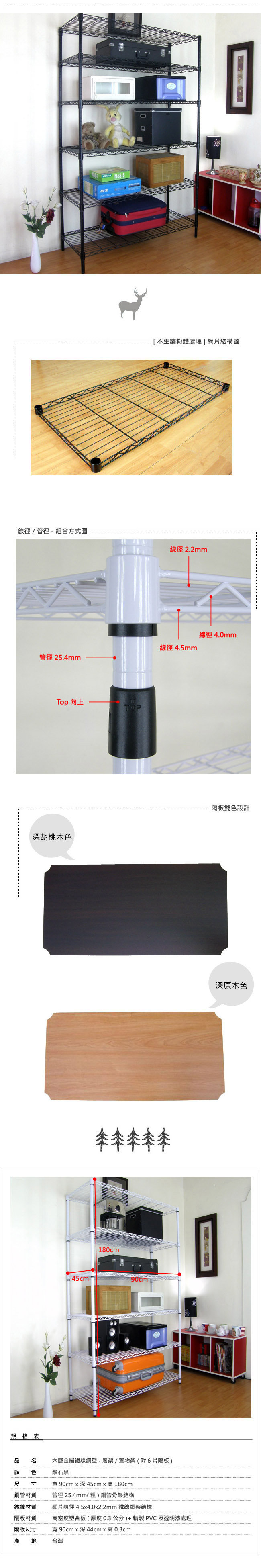 45DX90WX180H公分-六層金屬鐵線網架/置物架-鑽石黑[不生鏽粉體處理]-附6片隔板 ◆六層金屬[鐵線]網架/置物架,每層平圴承重力約100公斤(整組平圴承重力約600公斤)。 ◆100%台灣製造,結構簡單、組合方便,拆裝容易,不傷網架本體,再次使用品質不變。 ◆商品表面為鑽石黑[不生鏽材質粉體處理],網架完全可DIY組裝,結構簡單、拆組容易。 ◆每片金屬[鐵線]網架高度,可依需求自行調整,要高要低隨心所欲,可依照需求隨時調整。 ◆金屬[鐵線]網架,任何地點皆適用,營業用,工業用,家庭用,店面,倉儲,住家,搭配性強。 ◆鐵線材質:網片線徑4.5x4.0x2.2mm(橫線16條/直線6條)鐵線網架結構,粉體防鏽處理,耐刮、耐磨。 ◆商品尺寸為:90 公分(寬) x 45 公分(深) x 180 公分(高)。 ◆鋼管材質:鋼管管徑25.4mm(粗) 鋼管骨架 結構。 ◆商品產地:[精品嚴選] 100%台灣製造。 ◆商品屬性:簡單DIY。 鐵線網架專用"置物隔板"-雙色設計 ◆"置物隔板"為雙色設計,正面為深胡桃木色及背面為深原木色,可依喜歡顏色選擇使用。 ◆每片"置物隔板"厚度為3mm堅固耐用,置物隔板空間,可放置任何小物品。 ◆隔板材質:高密度塑合板(厚度0.3公分)+精製PVC及透明漆處理。 ◆隔板顏色:如圖 / 雙色設計=深胡桃木色 及 深原木色。 ◆隔板尺寸:90 公分(寬) x 44 公分(深) x 0.3 公分(高)。 ◆組裝方式:只要輕輕放上網片上即可完成。