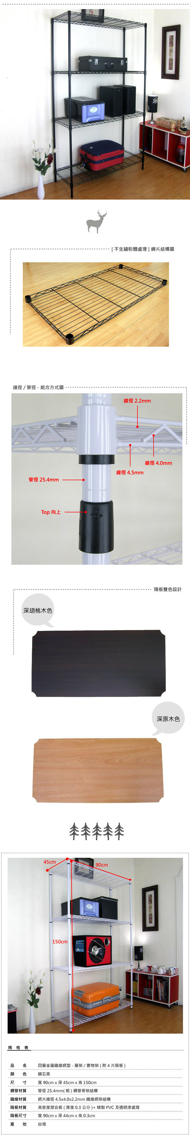 45DX90WX150H公分-四層金屬鐵線網架/置物架-鑽石黑[不生鏽粉體處理]-附4片隔板 ◆四層金屬[鐵線]網架/置物架,每層平圴承重力約100公斤(整組平圴承重力約400公斤)。 ◆100%台灣製造,結構簡單、組合方便,拆裝容易,不傷網架本體,再次使用品質不變。 ◆商品表面為鑽石黑[不生鏽材質粉體處理],網架完全可DIY組裝,結構簡單、拆組容易。 ◆每片金屬[鐵線]網架高度,可依需求自行調整,要高要低隨心所欲,可依照需求隨時調整。 ◆金屬[鐵線]網架,任何地點皆適用,營業用,工業用,家庭用,店面,倉儲,住家,搭配性強。 ◆鐵線材質:網片線徑4.5x4.0x2.2mm(橫線16條/直線6條)鐵線網架結構,粉體防鏽處理,耐刮、耐磨。 ◆商品尺寸為:90 公分(寬) x 45 公分(深) x 150 公分(高)。 ◆鋼管材質:鋼管管徑25.4mm(粗) 鋼管骨架 結構。 ◆商品產地:[精品嚴選] 100%台灣製造。 ◆商品屬性:簡單DIY。 鐵線網架專用"置物隔板"-雙色設計 ◆"置物隔板"為雙色設計,正面為深胡桃木色及背面為深原木色,可依喜歡顏色選擇使用。 ◆每片"置物隔板"厚度為3mm堅固耐用,置物隔板空間,可放置任何小物品。 ◆隔板材質:高密度塑合板(厚度0.3公分)+精製PVC及透明漆處理。 ◆隔板顏色:如圖 / 雙色設計=深胡桃木色 及 深原木色。 ◆隔板尺寸:90 公分(寬) x 44 公分(深) x 0.3 公分(高)。 ◆組裝方式:只要輕輕放上網片上即可完成。