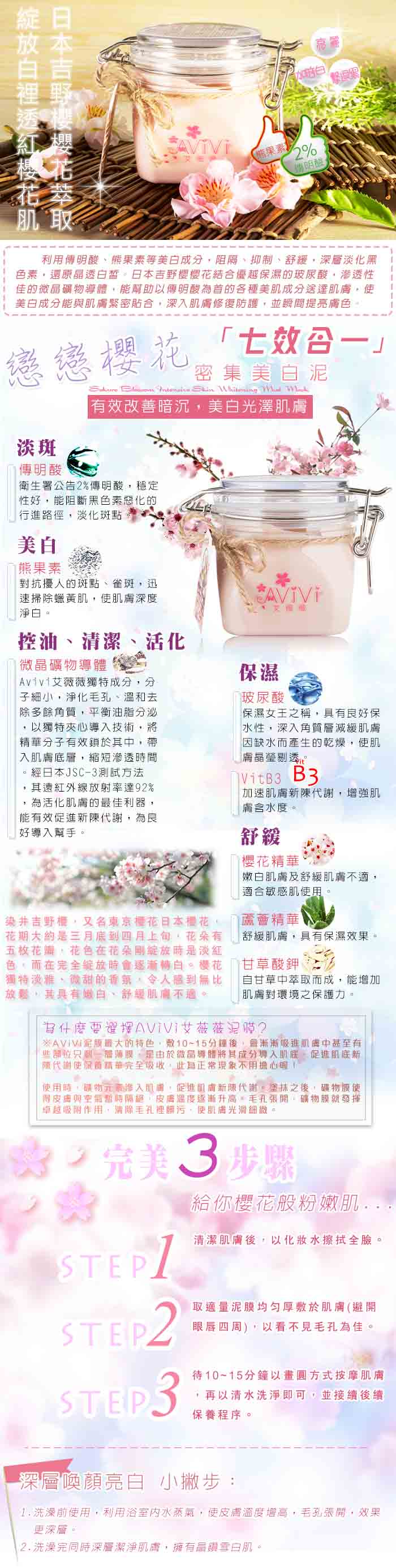 經獨特技術處理後的微米級純化天然陶礦,它的獨特之處在於能提高與保養原液更有效的結合,並可將精華分子有效鎖與其中,可延長肌膚的保濕時間。又因應消費者需求及台灣的氣候與膚質狀況, AViVi 所開發的每一系列產品,都經過數十次的安定及低敏測試,並通過SGS(UB/2013/30833、UB/2013/30834)無苯甲酸酯類防腐劑及重金屬檢測,提供您安全有效的產品。安心使用才能成為您心中最大的滿足。