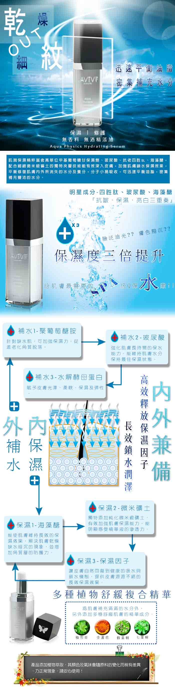 經獨特技術處理後的微米級純化天然陶礦,它的獨特之處在於能提高與保養原液更有效的結合,並可將精華分子有效鎖與其中,可延長肌膚的保濕時間。又因應消費者需求及台灣的氣候與膚質狀況, AViVi 所開發的每一系列產品,都經過數十次的安定及低敏測試,並通過SGS(UB/2013/30833、UB/2013/30834)無苯甲酸酯類防腐劑及重金屬檢測,提供您安全有效的產品。安心使用才能成為您心中最大的滿足。