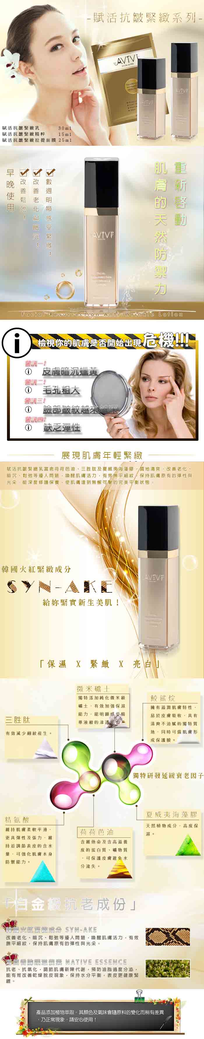 經獨特技術處理後的微米級純化天然陶礦,它的獨特之處在於能提高與保養原液更有效的結合,並可將精華分子有效鎖與其中,可延長肌膚的保濕時間。又因應消費者需求及台灣的氣候與膚質狀況, AViVi 所開發的每一系列產品,都經過數十次的安定及低敏測試,並通過SGS(UB/2013/30833、UB/2013/30834)無苯甲酸酯類防腐劑及重金屬檢測,提供您安全有效的產品。安心使用才能成為您心中最大的滿足。