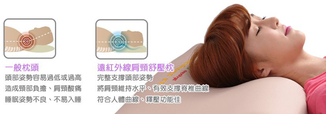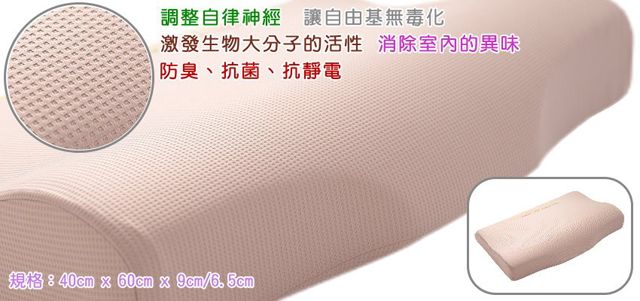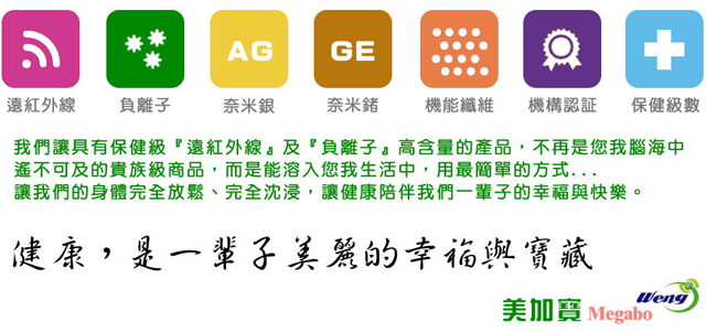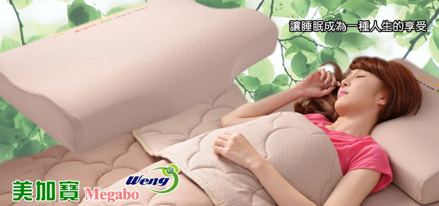 睡眠是全身上下最放鬆的休息,選擇一顆好的枕頭除了軟硬適中,還要能夠根據您的肩頸的弧度,做適度的密合,以達到肩頸肌肉完全放鬆的狀態,讓您的肩頸在睡眠中獲得最佳的舒適環抱。 美加寶 Megabo 遠紅外線肩頸舒壓枕,就是以醫學報導為基礎,以保健等級的涼眠適再加上舒適記憶綿為枕芯,再以多機能纖維布為表面布,透過人體工學的設計加上遠紅外線、負離子、奈米銀、奈米鍺等所釋放出來的元素,大幅提昇睡眠品質,讓您我夜夜好眠。 美加寶 Megabo 遠紅外線肩頸舒壓枕,提供頭部頸部適當的支撐,使頸部能保持自然彎曲狀態,讓您在還沒入睡前就能感受到彷彿孩兒時,被媽咪、爹地抱在懷中那種舒適的感覺,入睡後更能讓您的肩頸完全的支撐與放鬆,在進入深度睡眠之餘,還能享受遠紅外線及負離子的浸潤,讓明天更舒活。因為『她』有著.. ● 涼眠適材料,一年四季都可以使用,不會悶熱。 ● 遠紅外線肩頸舒壓枕,特別強調頭部與頸部以及床墊的服貼性。 ● 『她』可以讓頸部的延伸,完美的襯托頭部到最舒適的睡姿。 美加寶 Megabo 遠紅外線肩頸舒壓枕,除了使用涼眠適以及舒適記憶綿以外,更有著以下的特點.. ● 遠紅外線,可對抗擾人失眠,進而達到完全睡眠的效果。 ● 負離子,可以讓自由基無毒化,促進新陳代謝。 ● 炭新纖維,有著多微孔構造,表面積可達每克300平方公尺之大,所以吸附力強,讓室內空氣更清新。 ● 奈米銀,有著防臭、抗菌、抗靜電,更有著熱力學的特性,進而能營造冬暖夏涼的睡眠環境。 ● 奈米鍺,可激發生物大分子的活性。 美加寶 Megabo『遠紅外線』及『負離子』的含量,均超出國內『保健級』產品中的標準檢測含量,因為我們堅持把最好的產品呈現給您,讓健康成為您一輩子的幸福與寶藏。 由於『遠紅外線』它具有『加速血流量』達到新陳代謝的效果,又具有『滲透』『共振』的效果,而達到保健的效果,因為『身體的保健』決不是一朝一夕即可完成的,唯有持之以恆與適度,才是正確且長久的方式,在此美加寶 Megabo與您一同分享。