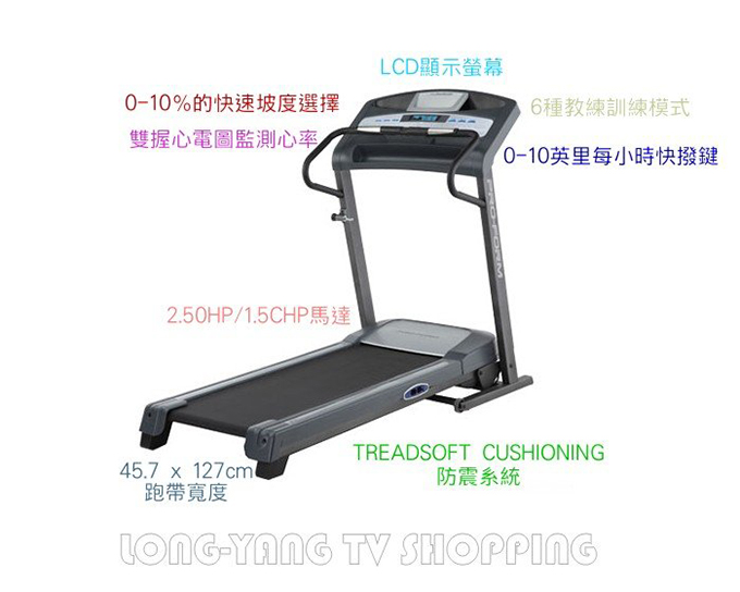 型號:PFTL39110 2.50HP/1.5CHP馬達 馬達順暢且一貫作業,2.50HP/1.5CHP。這種電機馬達適合中等鍛煉。 TREADSOFT CUSHIONING防震系統 TREADSOFT CUSHIONING防震緩衝系統,減少影響你的關節,並提供更舒適的運動。 雙握心電圖監測心率™ 透過心率感應握把可顯示監測您的鍛煉心率。確保您正確的訓練目標。 LCD顯示螢幕 LCD顯示速度、時間、坡度及消耗卡路里等訊息。 0-10%的快速™坡度選擇 快撥鍵按鈕,讓您一觸快撥鍵按鈕立即變換跑步機的傾斜坡度(0-12%坡度)。 改變您的跑步機坡度,提高你的鍛煉強度。這種完全自動化的功能可以幫助您從0-10%坡度快捷方便選擇。高坡度幫助您燃燒更多的熱量,降低影響您的關節。 45.7 × 127 Treadbelt 45.7 x 127cm跑帶寬度,此款跑帶超越普通跑帶,更加安靜,流暢的運作。 0-10英里每小時™快撥鍵 快撥鍵按鈕,讓您一觸快撥鍵按鈕立即變換跑步機的速度(0-10英里)。 6種教練訓練模式 6種教練訓練模式,自動調整速度和坡度的鍛練課程。速度、時間、坡度依訓練模式自動調整變換,您只要準備好隨著運動訓練模式即可! 承重上限 最高承重上限為113kg 尺寸 177.8長 x 82.8寬 x 134.6高 (cm)
