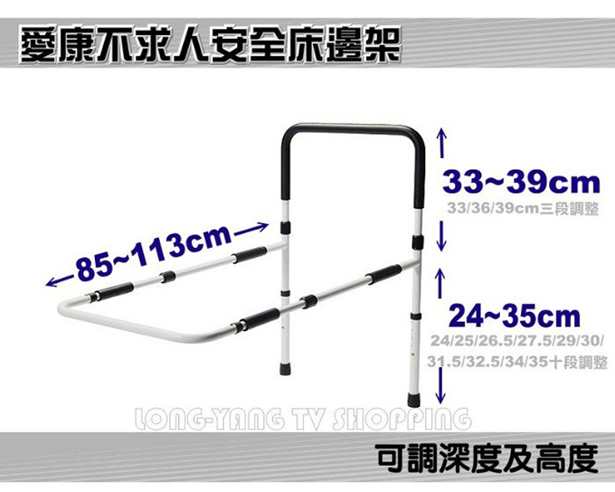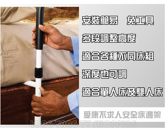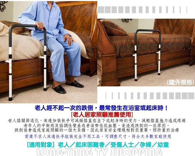 [老人] 很多老人在起床時因暈眩而不慎跌倒,老人最經不起摔,一摔後則成為家人的一項照顧負擔,居家安全要預先做好,以防萬一,居家安全必備 [孕婦] 懷孕婦女,若起身不慎,會動到胎氣,懷胎十月相當辛苦,輔助床邊扶手可協助起床及上床的方便 [小孩] 小Baby在睡眠或玩耍時,很容易不小心滾落床下,頭部落地,不容忽視的一定要做好安全防護 [受傷人士/殘障者] 受傷人士或起身不便之殘障者,若有起身困難情形,可藉由扶手施力而自行起身,不需再求人 免工具即可組裝,適合單人床/雙人床,使用方便簡單,整組圓管伸縮設計,台灣生產,專利設計外銷歐美多年