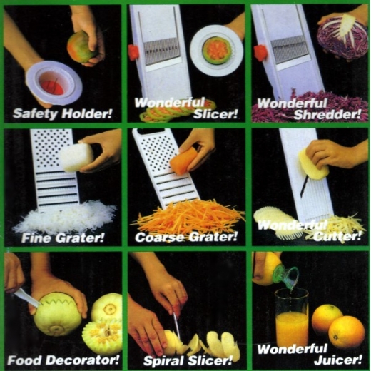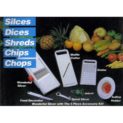 萬能切片器 料理食物的最佳幫手 廚房百寶好幫手,切絲、切片、切條、切丁、榨汁、刻花,一次擁有多樣性料理方法,不必到處添購一堆用具,好用順手不油膩。 多重選擇性的廚房配件 薄片.切丁.切絲.切片.刴碎 配件:安全拖盤.螺旋切刀.V型刀.餅形切割器.多用途搓板.柳丁榨汁器