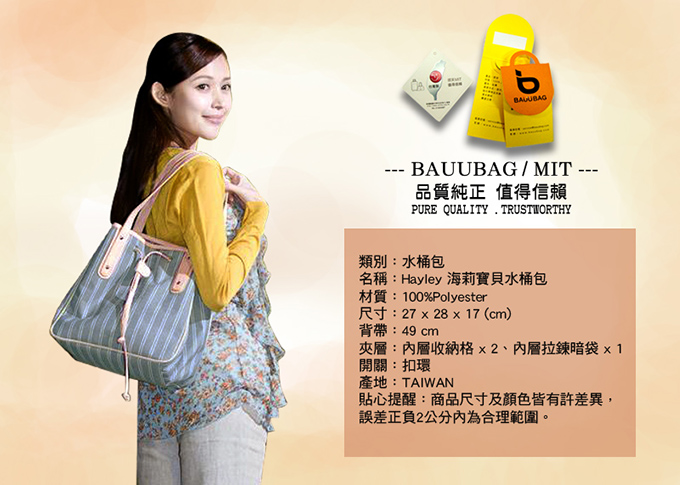 從湖水中誕生的海莉,平靜安穩,在細節中品味出包的用心與細緻。 部落客推薦 時尚優雅的MIT好包~海莉Hayley/BAUUBAG-水桶包 MIT的商品身份證這個水桶包也有哦! 瞧~除了品牌的b字LOGO吊牌之外,再來就是優質商品的最佳證明~MIT微笑標章的吊卡 吊於上印有經官方的認證核可的字號(8碼編號),才是正港MIT,就是安心的保證... 只要利用這8碼到MIT網站上查詢來辨識真偽,是不是真的很方便? 而且還可以順便看一下官方網站對包包這一類的檢驗項目有哪些哦! 想要擁有"MIT"的身份,就是要通過這些檢查的項目,所以MIT商品也難怪比較讓人安心! 部落客網址