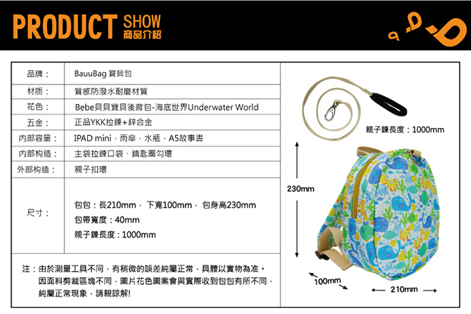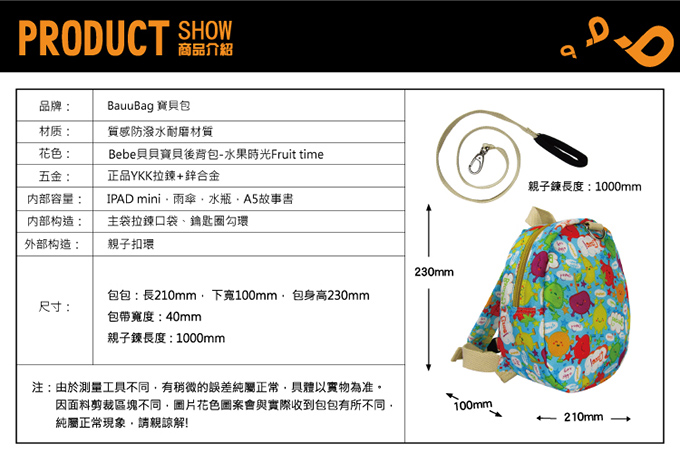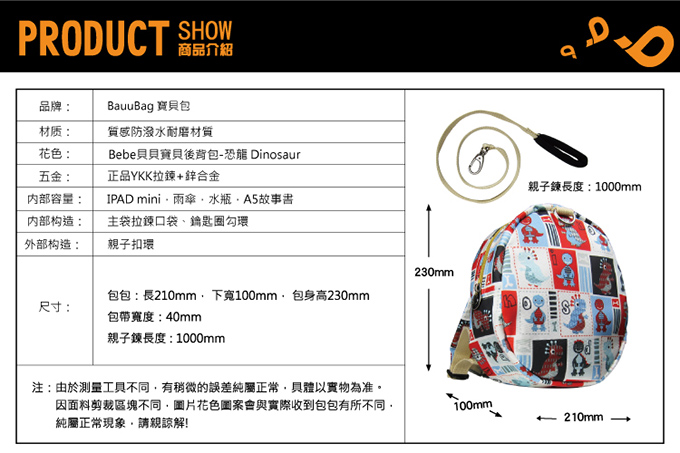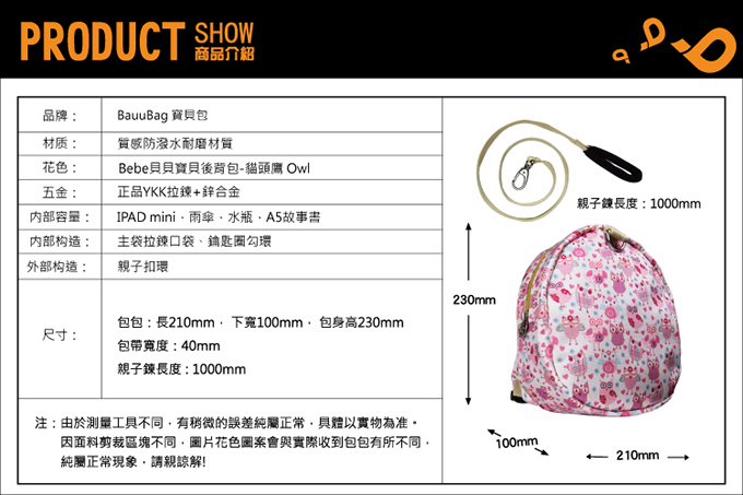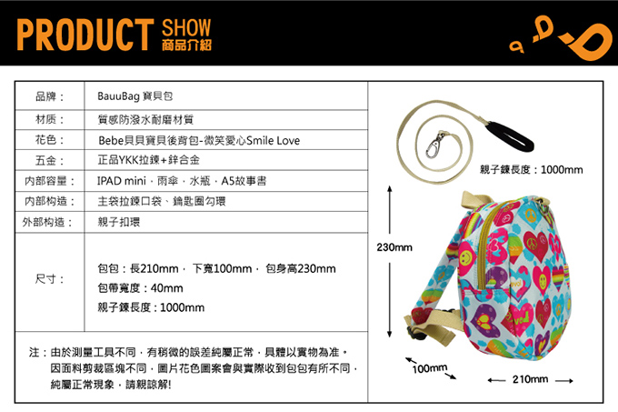 類別:小孩後背包 名稱: Bebe 貝貝寶貝後背包 材質:100% Polyester 尺寸: 21 cm x 23 cm x 10 cm 背帶:31-52 cm 附件:親子繩 x1 夾層:內層拉鍊暗袋 x1 開關:拉鍊 貼心提醒:商品尺寸及顏色皆有許差異,誤差正負2公分內為合理範圍