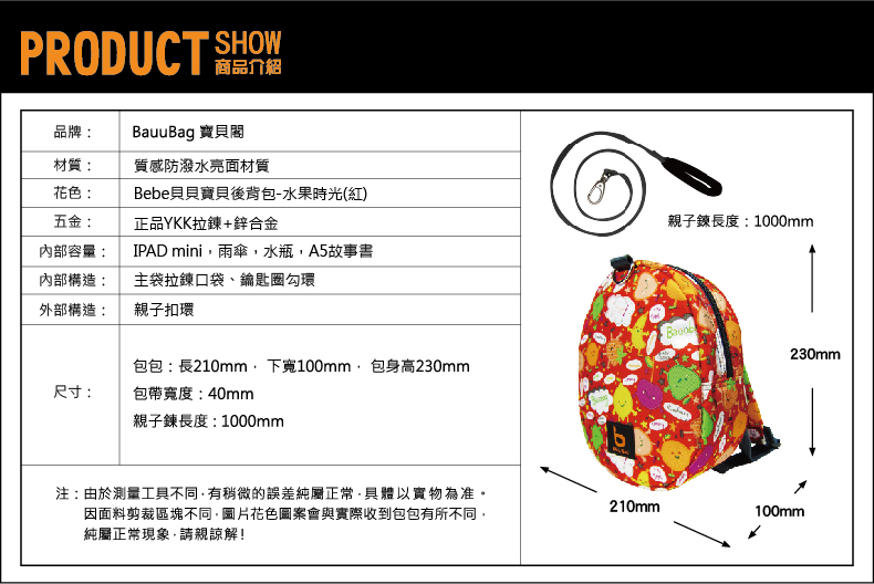 類別:後背包 名稱:Bebe貝貝寶貝後背包 材質:100% Polyester 尺寸:21 x10 x23 (cm) 背帶:30-45(cm) 親子鍊長度:100 (cm) 內部:主袋拉鍊口袋乙個、鑰匙勾環乙個 外部:親子扣環 提帶材質:安全織帶 貼心提醒:商品尺寸及產色皆有許差異,誤差正負2公分為合理範圍