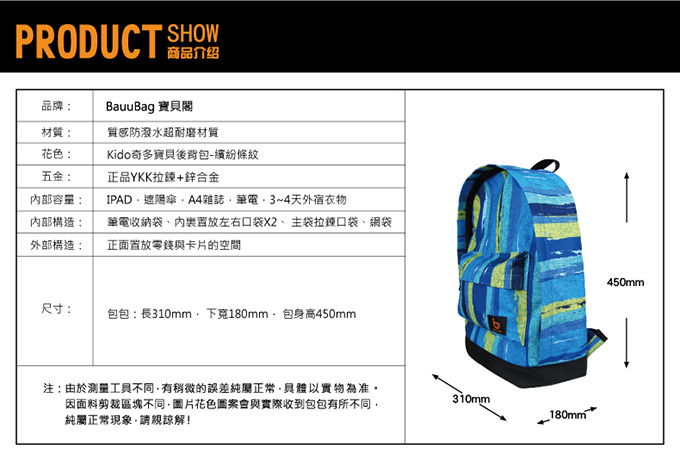 商品組合: 配件: 尺寸:31 cm x 45 cm x 18 cm 材質:100% Polyester 重量:0.8KG 顏色:繽紛橘 / 繽紛藍 / 繽紛紅 / 灰黑格紋 產地:台灣 開口方式:拉鍊