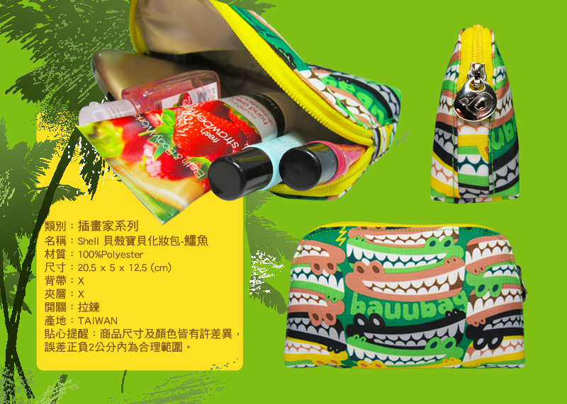 類別:插畫家系列 名稱;Shell貝殼寶貝化妝包-鱷魚 材質;100% Polyester 尺寸;21 x 5 x 13 (cm) 開關;拉鍊 貼心提醒;商品尺寸及顏色皆有許差異,誤差正負2公分內為合理範圍