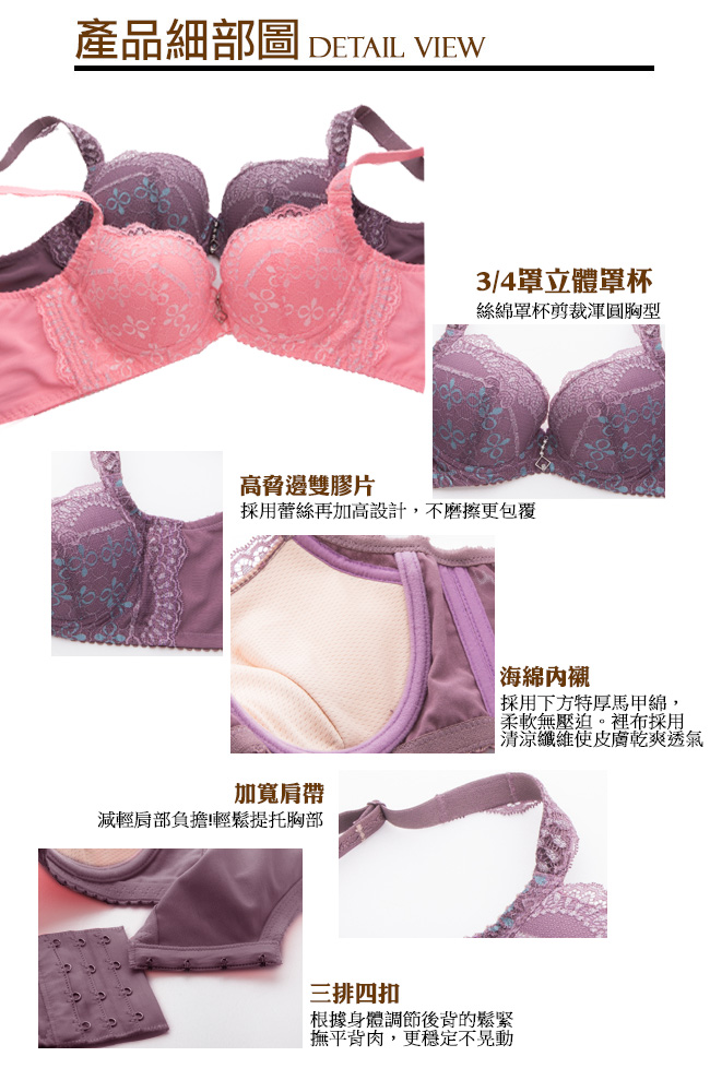 內容物品:內衣*1 胸墊款式: (B)3/4下厚上薄成型模 (C)下緣1cm厚向上漸薄 (D)均薄 稱墊:不可拆 厚度:A杯2cm.B杯1cm 肩帶:不可拆、可調 背釦:背扣式、三排四勾 彈性:280D雙層高彈性布 顏色:咖啡紫色 尺寸:ABC(32-38) 內褲-M、L、XL 產地:台灣 建議消費者穿著對照尺寸 (M 適合腰圍 23"-26") (L 適合腰圍 26"-29") (XL適合腰圍 29"-32") (Q適合腰圍 32"-34") 胸罩: 32/A/B/C/D/E 34/A/B/C/D/E 搭配M內褲 胸罩: 36/A/B/C/D/E 搭配L內褲 胸罩: 38/B/C/D/E 40/C/D/E 搭配XL內褲 洗滌方式: 1.請用中性洗潔劑手洗。 2.請用溫水手洗(請深淺色衣服分開洗滌) 3.不建議烘乾熨燙。 4.洗淨後請輕扭整型後倒掛夾在衣架晾乾。
