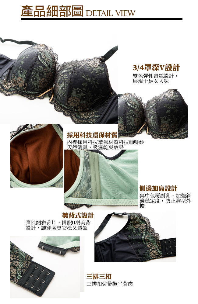 本商品規格 本商品規格:內衣*1 胸墊款式:3/4罩杯、B罩下厚上薄加厚3CM C罩均勻薄襯 稱墊:不可拆 厚度:1cm 肩帶:不可拆、可調 背釦:三排三鉤扣 彈性:雙層彈性布 顏色:墨綠色 尺寸:BC(32-38) 材質:面料85% 聚酯纖維+ 15% 彈性纖維 裡料100%聚酯纖維咖啡紗 建議消費者穿著對照尺寸 (M 適合腰圍 23"-26") (L 適合腰圍 26"-29") (XL適合腰圍 29"-32") 胸罩: 32/A/B/C/D/E 34/A/B/C/D/E 搭配M內褲 胸罩: 36/A/B/C/D/E 搭配L內褲 胸罩: 38/B/C/D/E 搭配XL內褲 內褲:M、L、XL 產地:台灣 洗滌方式: 1.請用中性洗潔劑手洗。 2.請用溫水手洗(請深淺色衣服分開洗滌) 3.不建議烘乾熨燙。 4.洗淨後請輕扭整型後倒掛夾在衣架晾乾。 注意事項 如商品本身有暇疵問題,請於貨到10日內來電客服中心辦理退換貨服務。 因商品屬個人衛生用品,請著貼身衣物再試穿唷! 所有商品均為新品,如有拆標、下水、污損、短缺,恕不接受退換貨。 辦理商品退換貨時,商品如有贈品或配件,麻煩請一併寄回,否則視同缺件無法受理喔!.jpg)