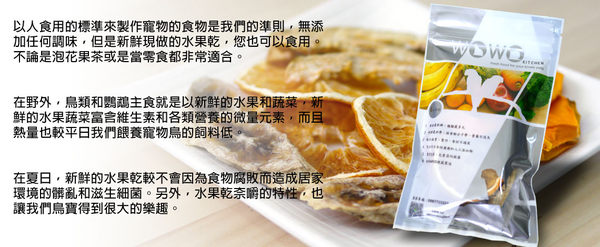 在夏日,新鮮的水果乾較不會因為食物腐敗而造成居家環境的髒亂和滋生細菌。另外,水果乾奈嚼的特性,也讓我們鳥寶得到很大的樂趣。