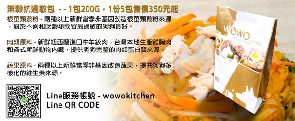 商品品名 天然食品/寵物/狗狗鮮食:無穀無過敏營養包 商品介紹 內容物: 澱粉以及微量元素 - 選用兩種以上狗狗不易過敏的澱粉來源(非基因改造番薯、南瓜和馬鈴薯)。 肉類原料 - 新鮮紐西蘭進口牛羊絞肉,台灣本地生產雞胸肉和各式新鮮動物內臟,提供狗狗完整的肉類蛋白質來源。 蔬果原料 - 兩種以上新鮮當季非基因改造蔬果,提供狗狗多樣化的維生素源。 為何要買天然的WOWO Kitchen 新鮮天然無法欺騙消費者–目前科學還無法將人造食品製造成天然食材的模樣,吃看的見的天然食物,吃會腐敗的天然食物,才是最安全沒有受到加工的食物。 食品檢驗是可以作假和欺騙的–報章媒體說的三聚氰胺的氮會造成蛋白質檢測含量高的假象,粗糙很古老的檢驗法-凱氏定氮法(Kjeldal Method)。加入少許三聚氰胺能顯著提高奶粉等食品中的氮含量,從而換算出合適的蛋白含量(國家規定之水平),使僞劣産品得以堂而皇之的通過正規渠道流入市場。 非天然食品添加物的風險– 非天然食品添加物的製作方式大多是化學合成,化學式中A+B=C+D,C或許是寵物適合的添加物,但是D是否有毒?是否有殘留在添加物中則無從判定。 台灣沒有動物食品法,所以我們按照AFFCO(美國飼料協會)規範來製作– 所有市售的寵物食品只要沒有出事,基本上是無任何機關在監督。為了讓寵物吃得健康,我們不採旁門左道的偏方,一切回歸科學和數據,提供AFFCO認可食材和比例的產品。 商品規格 商品容量:1 kg 產地:台灣 肉等蛋白質原料 - 50% 貼心備註 -開封後請冷藏保存,並請盡速食用 使用說明 本產品可微波可隔水加熱,食用前請加熱到室溫,平時保存請冷凍。