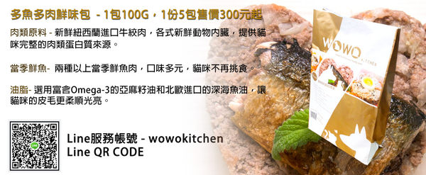 商品品名 多魚多肉鮮味包 商品介紹 內容物: 肉類原料 - 新鮮紐西蘭進口牛絞肉,各式新鮮動物內臟,提供貓咪完整的肉類蛋白質來源。 當季鮮魚- 兩種以上當季鮮魚肉,口味多元,貓咪不再挑食。 油脂- 選用富含Omega-3的亞麻籽油和魚油,讓貓咪的皮毛更柔順光亮。 為何要買天然的WOWO Kitchen 新鮮天然無法欺騙消費者–目前科學還無法將人造食品製造成天然食材的模樣,吃看的見的天然食物,吃會腐敗的天然食物,才是最安全沒有受到加工的食物。 食品檢驗是可以作假和欺騙的–報章媒體說的三聚氰胺的氮會造成蛋白質檢測含量高的假象,粗糙很古老的檢驗法-凱氏定氮法(Kjeldal Method)。加入少許三聚氰胺能顯著提高奶粉等食品中的氮含量,從而換算出合適的蛋白含量(國家規定之水平),使僞劣産品得以堂而皇之的通過正規渠道流入市場。 非天然食品添加物的風險– 非天然食品添加物的製作方式大多是化學合成,化學式中A+B=C+D,C或許是寵物適合的添加物,但是D是否有毒?是否有殘留在添加物中則無從判定。 台灣沒有動物食品法,所以我們按照AFFCO(美國飼料協會)規範來製作– 所有市售的寵物食品只要沒有出事,基本上是無任何機關在監督。為了讓寵物吃得健康,我們不採旁門左道的偏方,一切回歸科學和數據,提供AFFCO認可食材和比例的產品。 商品規格 商品容量: 500g 產地:台灣 禽畜肉等蛋白質原料 - 55% 貼心備註 -開封後請冷藏保存,並請盡速食用 使用說明 本產品可微波可隔水加熱,食用前請加熱到室溫,平時保存請冷凍。