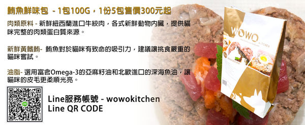 商品品名 天然食品/寵物/貓咪鮮食:鮪魚鮮味包 商品介紹 內容物: 肉類原料 - 新鮮紐西蘭進口牛絞肉,各式新鮮動物內臟,提供貓咪完整的肉類蛋白質來源。 新鮮黃鰭鮪- 鮪魚對於貓咪有致命的吸引力,建議讓挑食嚴重的貓咪嘗試。 油脂- 選用富含Omega-3的亞麻籽油和魚油,讓貓咪的皮毛更柔順光亮。 為何要買天然的WOWO Kitchen 新鮮天然無法欺騙消費者–目前科學還無法將人造食品製造成天然食材的模樣,吃看的見的天然食物,吃會腐敗的天然食物,才是最安全沒有受到加工的食物。 食品檢驗是可以作假和欺騙的–報章媒體說的三聚氰胺的氮會造成蛋白質檢測含量高的假象,粗糙很古老的檢驗法-凱氏定氮法(Kjeldal Method)。加入少許三聚氰胺能顯著提高奶粉等食品中的氮含量,從而換算出合適的蛋白含量(國家規定之水平),使僞劣産品得以堂而皇之的通過正規渠道流入市場。 非天然食品添加物的風險– 非天然食品添加物的製作方式大多是化學合成,化學式中A+B=C+D,C或許是寵物適合的添加物,但是D是否有毒?是否有殘留在添加物中則無從判定。 台灣沒有動物食品法,所以我們按照AFFCO(美國飼料協會)規範來製作– 所有市售的寵物食品只要沒有出事,基本上是無任何機關在監督。為了讓寵物吃得健康,我們不採旁門左道的偏方,一切回歸科學和數據,提供AFFCO認可食材和比例的產品。 商品規格 商品容量: 500g 產地:台灣 禽畜肉等蛋白質原料 - 65% 貼心備註 -開封後請冷藏保存,並請盡速食用 使用說明 本產品可微波可隔水加熱,食用前請加熱到室溫,平時保存請冷凍。