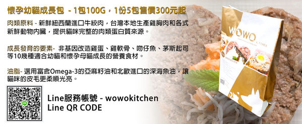 商品品名 天然食品/寵物/貓咪鮮食:懷孕幼貓成長包 商品介紹 內容物: 肉類原料 - 新鮮紐西蘭進口牛絞肉,台灣本地生產雞胸肉和各式新鮮動物內臟,提供貓咪完整的肉類蛋白質來源。 成長發育的要素- 非基因改造雞蛋、雞軟骨、吻仔魚、茅斯起司等10幾種適合幼貓和懷孕母貓成長的營養食材。 油脂- 選用富含Omega-3的亞麻籽油和魚油,讓貓咪的皮毛更柔順光亮。 為何要買天然的WOWO Kitchen 新鮮天然無法欺騙消費者–目前科學還無法將人造食品製造成天然食材的模樣,吃看的見的天然食物,吃會腐敗的天然食物,才是最安全沒有受到加工的食物。 食品檢驗是可以作假和欺騙的–報章媒體說的三聚氰胺的氮會造成蛋白質檢測含量高的假象,粗糙很古老的檢驗法-凱氏定氮法(Kjeldal Method)。加入少許三聚氰胺能顯著提高奶粉等食品中的氮含量,從而換算出合適的蛋白含量(國家規定之水平),使僞劣産品得以堂而皇之的通過正規渠道流入市場。 非天然食品添加物的風險– 非天然食品添加物的製作方式大多是化學合成,化學式中A+B=C+D,C或許是寵物適合的添加物,但是D是否有毒?是否有殘留在添加物中則無從判定。 台灣沒有動物食品法,所以我們按照AFFCO(美國飼料協會)規範來製作– 所有市售的寵物食品只要沒有出事,基本上是無任何機關在監督。為了讓寵物吃得健康,我們不採旁門左道的偏方,一切回歸科學和數據,提供AFFCO認可食材和比例的產品。 商品規格 商品容量: 500g 產地:台灣 禽畜肉等蛋白質原料 - 70% 貼心備註 -開封後請冷藏保存,並請盡速食用 使用說明 本產品可微波可隔水加熱,食用前請加熱到室溫,平時保存請冷凍。