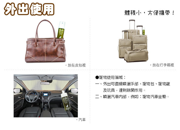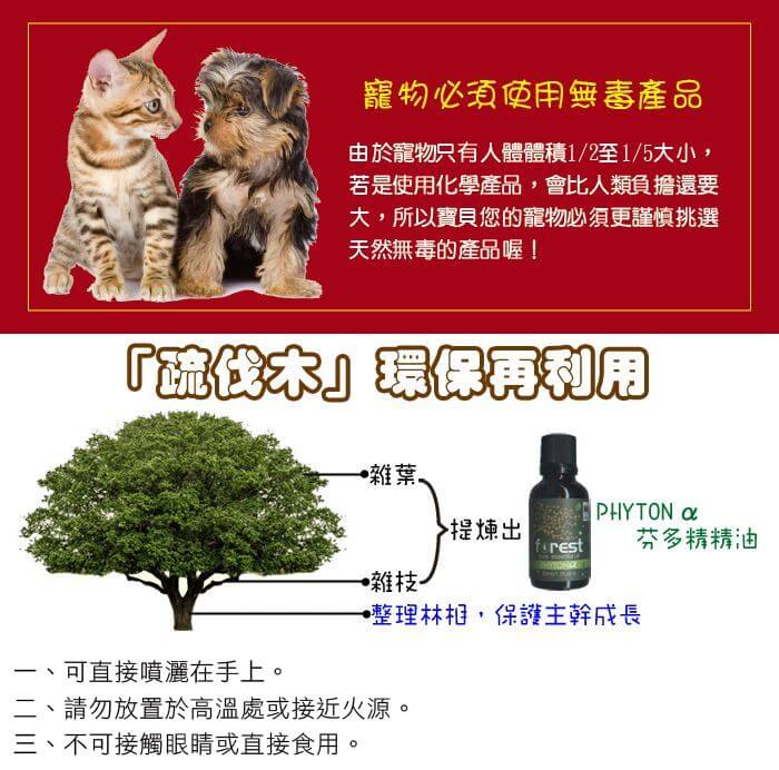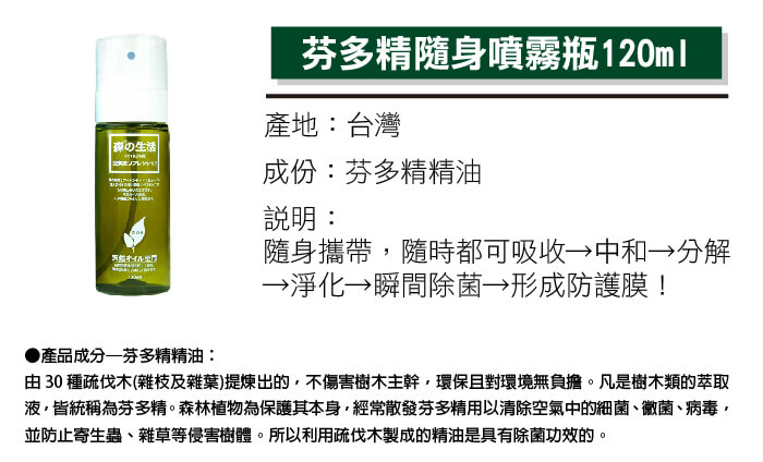 產品簡介~ 森呼吸芬多精隨身噴霧瓶 120ml ‧芬多精噴霧罐應用範圍廣泛,不殘留、自然的香味,享受森林的香氣與精氣。 大自然空氣維他命~芬多精 不可思議森林之香 芬多精主要成份 帖苹-松烯(terpene)芳香性碳化氫。 帖苹就是半帖(異戊間二烯,isoprene)。在生物體內所結合化和物的統稱,有的具有特別的香氣,用為 香料;有的具有殺菌力。樹葉、樹幹含有揮發性物質的天然煙霧(aerosol)芬多精(phytoncidere)- 植物的殺菌素。 森呼吸芬多精隨身噴霧瓶120ml 特長於室內空氣、日用品、 家電製品(冷氣機、空氣清淨機、加濕機、冷藏庫)衣物、鞋類、床舖、廚房、壁面、自動車(室內) 、密 閉空間、辦公室、幼稚園、學校、體育館、銀行、營業場所、等全面噴霧除菌。 消臭除臭 皮鞋、運動鞋、鞋櫃、垃圾桶、腳 墊。 幫助睡眠 房間內、床單被套上、床舖下、防塵璊、舒緩一天緊繃的情緒。 淨化空氣 客廳、廚房、浴室、衣櫃、辦公室、抽煙室內 分解煙味 汽車內、能有效的分解車內煙味、黴味、皮椅、塑膠味、使車內空氣變清新。 玄關 回到家時噴灑於全身衣服,噴霧抗菌用,且成份天然,對人體無副作如想使鞋子或雨傘發霉臭味 變得清爽請予以噴灑。 客廳 朝向客廳的中央或沙發週邊等人們聚集的角落噴灑,如此PHYTONα芬多精油的活性份子,將 會迅速擴散四週,將異味吸收→中和→分解→淨化。‧可噴灑於布質沙發上消除汗臭異味。 廚房 因為每天都在使用,所以,食品,調味料,廚餘等產生的廚房獨特臭味,最不易消失。如廚房的 邊角,調味料、放有乾料的廚櫃週邊等,都可以《清新罐》噴灑。廚房的討厭臭味,將會消失,而充滿清 爽的芬多精氣息。 寢室 於就寢前一刻,朝著房間中央空間來噴灑《清新罐》芬多精的活性份子,會使壓力或緊張從全身 獲得解放,並誘導睡眠,而充分解除一天的疲勞,放鬆來入眠之。還可以噴灑在床單、被套、彈簧床。 浴室 噴灑於浴室立即消除異味。 .jpg)