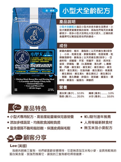 • 小型犬專用配方,高密度能量確保完善營養
