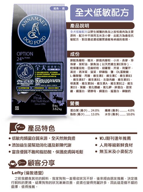 • 低敏肉類蛋白質來源,全天然無負擔