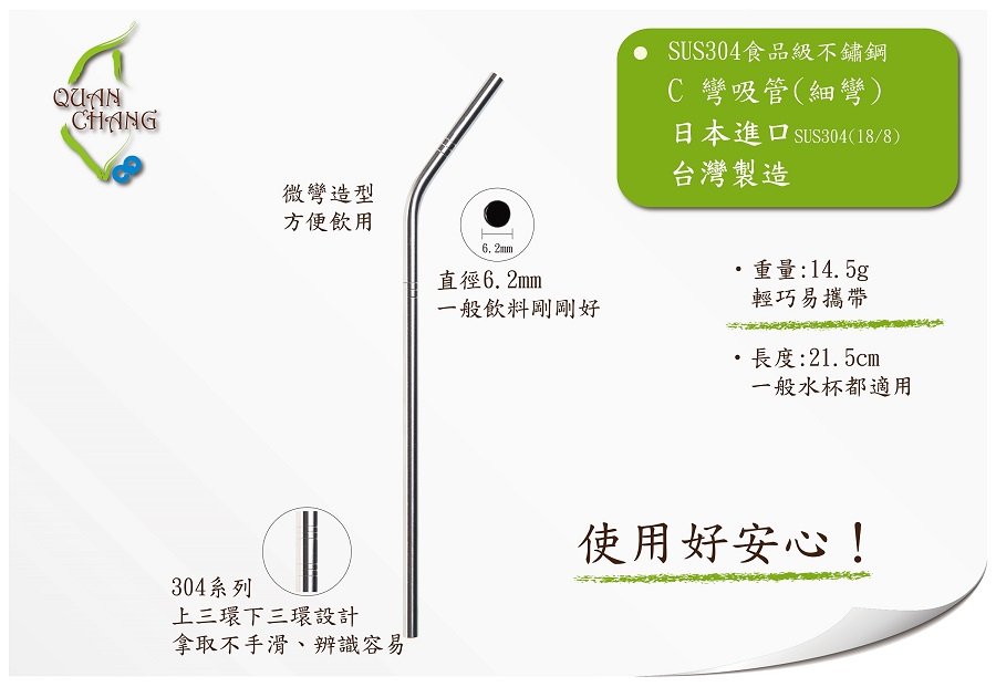 SUS304-18/8系列鎳含量比一般不鏽鋼高,耐酸、耐弱鹼、抗腐蝕的特性較佳,全系列吸管選用高純度不鏽鋼製成,非回收鋼材,醫療用品等級製作程序,經過研磨、拋光、鈍化處理與高溫殺菌消毒,並通過國際級SGS的檢驗,品質安心有保障,一起愛上環保健康生活,拒絕塑化人生