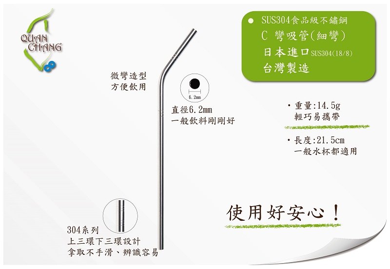 SUS304-18/8系列鎳含量比一般不鏽鋼高,耐酸、耐鹼、抗腐蝕的特性較佳,全系列吸管選用高純度不鏽鋼製成,非回收鋼材,醫療用品等級製作程序,經過研磨、拋光、鈍化處理與高溫殺菌消毒,並通過國際級SGS的檢驗,品質安心有保障,一起愛上環保健康生活,拒絕塑化人生