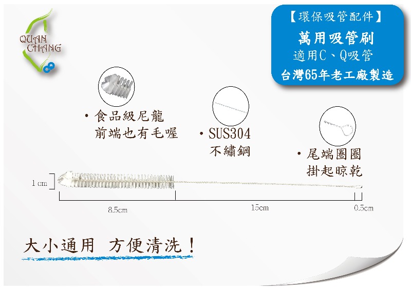 吸管刷—食品級尼龍刷毛、SUS304不鏽鋼握把
